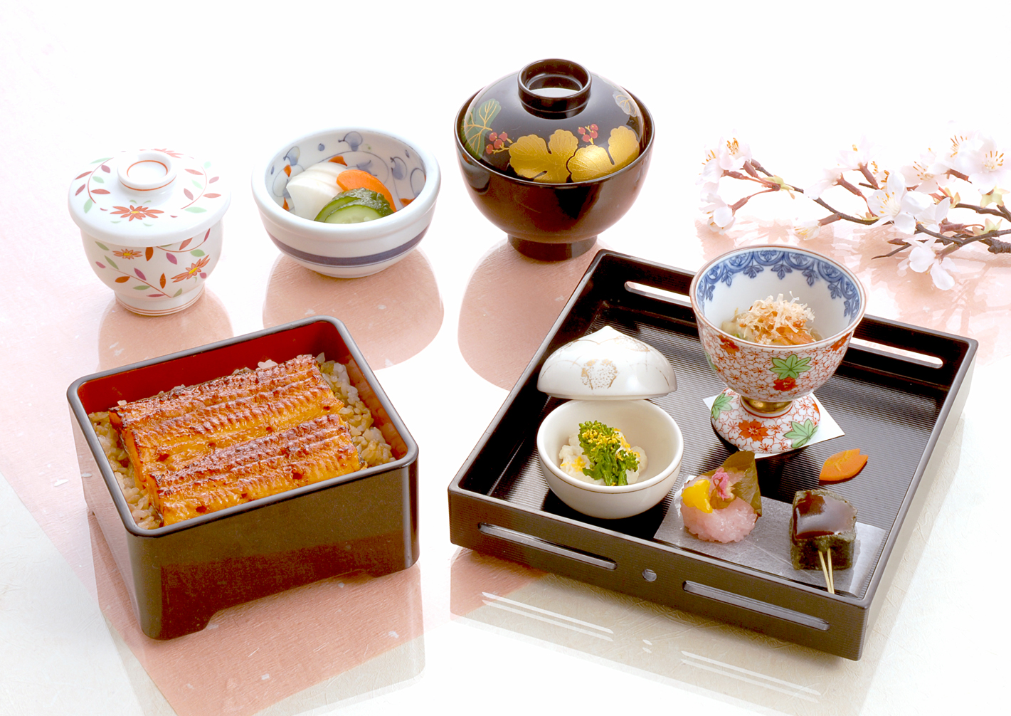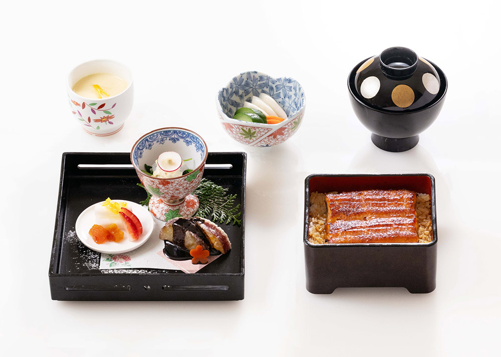 前菜(東寺和え、蕪柚ソース、甘藷蜜煮黒ごま庵)・うな重竹・茶碗蒸し・味噌汁・香の物